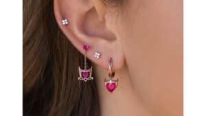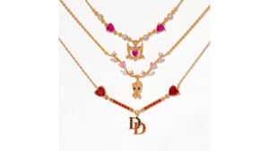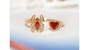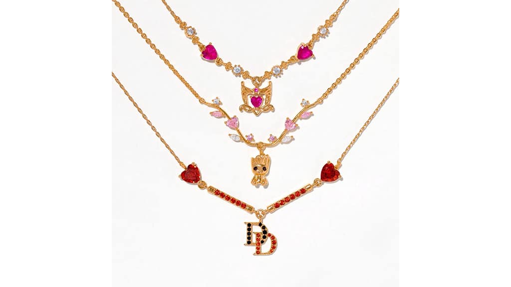 Fans can supe-up their sparkle with a variety of Marvel designs. Spider-Man fans can thwip out an adjustable ring, Daredevil lovers can rock the hero’s stone-studded logo, and Scarlet Witch stans can cast a spell with pink hoops inspired by her iconic crown. Instead of flowers, give your beloved a botanical Baby Groot necklace. Featuring the tiny tree surrounded by pink and green leaves, there’s no better way to say “I am Groot” to the one you love.