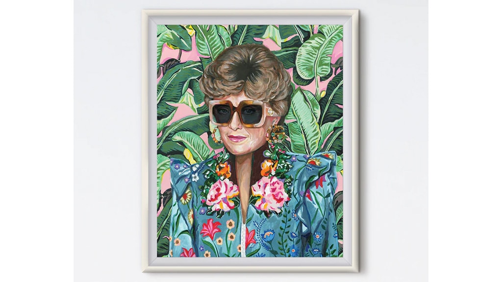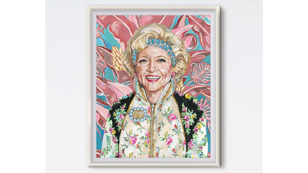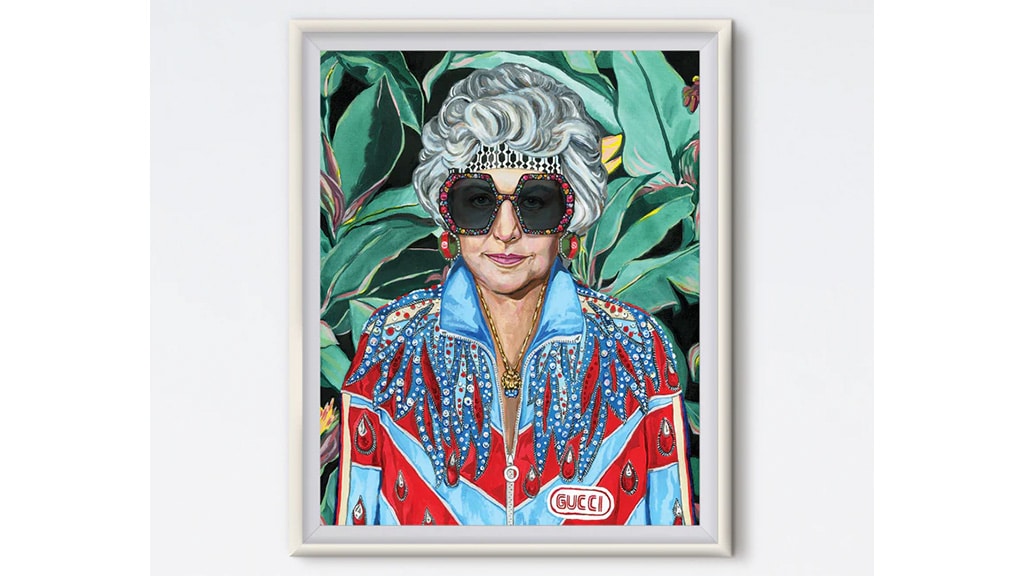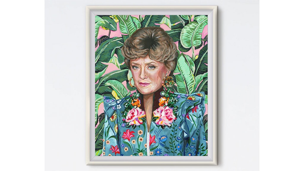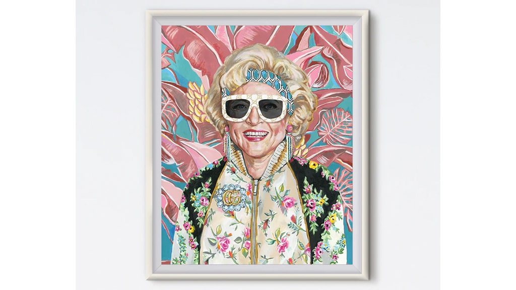 Heather Perry's maximalist acrylic paintings feature each Golden Girl, with or without sunglasses, wearing a Miami-inspired outfit with a lanai-style background. Available as prints or iron-on patches.