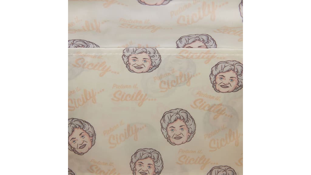 This wicker handbag looks just like Sophia's. The faux leather wicker purse has beaded trim and handles, a Stay Golden charm, and lining featuring Sophia's face.