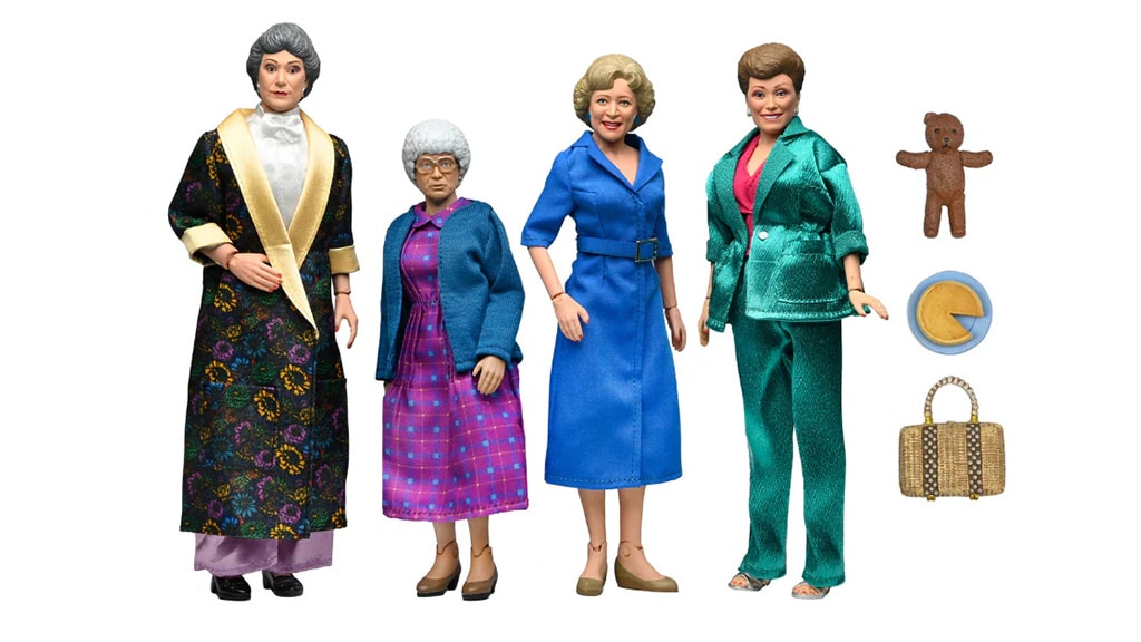 This action figure set celebrates 40 years of The Golden Girls, with articulated figures of Dorothy, Rose, Blanche, and Sophia. Accessories include Rose's teddy bear, Sophia's purse, and a cheesecake. Ships early 2026.