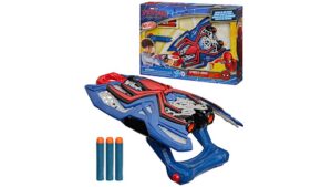 Supe up your cosplay with the Spider-Man Wisecrackin’ Glow Mask. Press the button on the side to activate more than 30 thwips and quips, and the eye lenses will light up to match. To take your look to the next level, grab the glow-in-the-dark Nerf Web Strike Blaster, which fires web darts with powerful precision using its double-barreled blasting action.