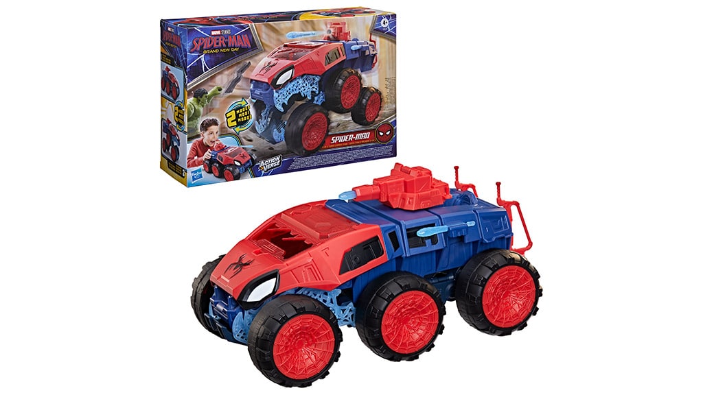 Meanwhile, little fans can save the day at super speed with the Spider-Man 2-in-1 Super Chompin’ Tank. Intended for kids ages 4 and up, this vehicle features a projectile launcher, web fangs, and a cockpit that holds up to two ActionVerse 4.5-inch figures. Zoom through the city in Street Mode, or flip into Off-road Mode for epic chase sequences.