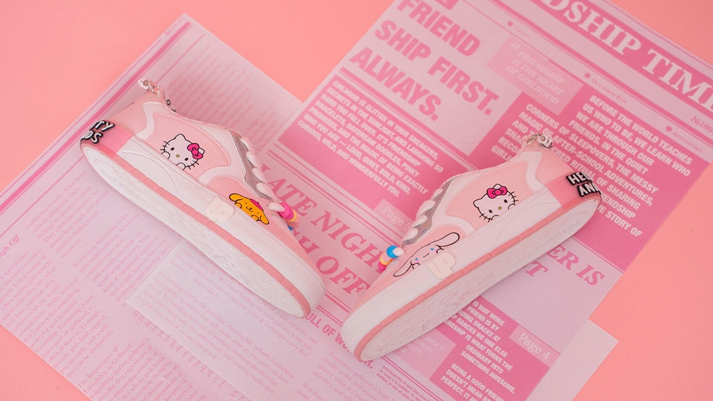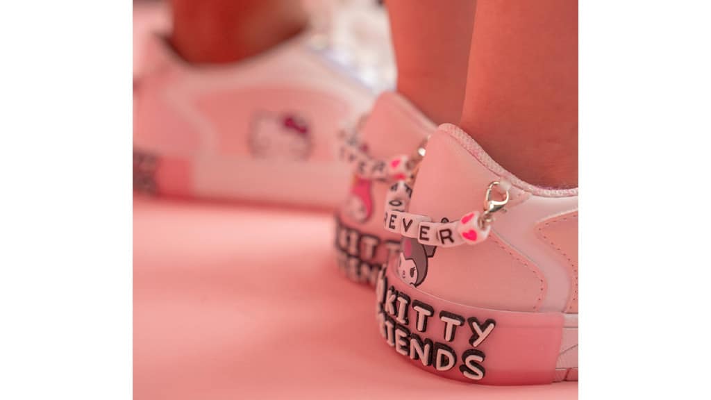 Make Sanrio steps with sneakers inspired by Hello Kitty and Friends. Across each iridescent pink sneaker, fans can find graphics of Hello Kitty, Kuromi, My Melody, Cinnamoroll, and Pompompurin. The shoes also feature friendship bracelet accessories, lace charms, and Sanrio-inspired details.