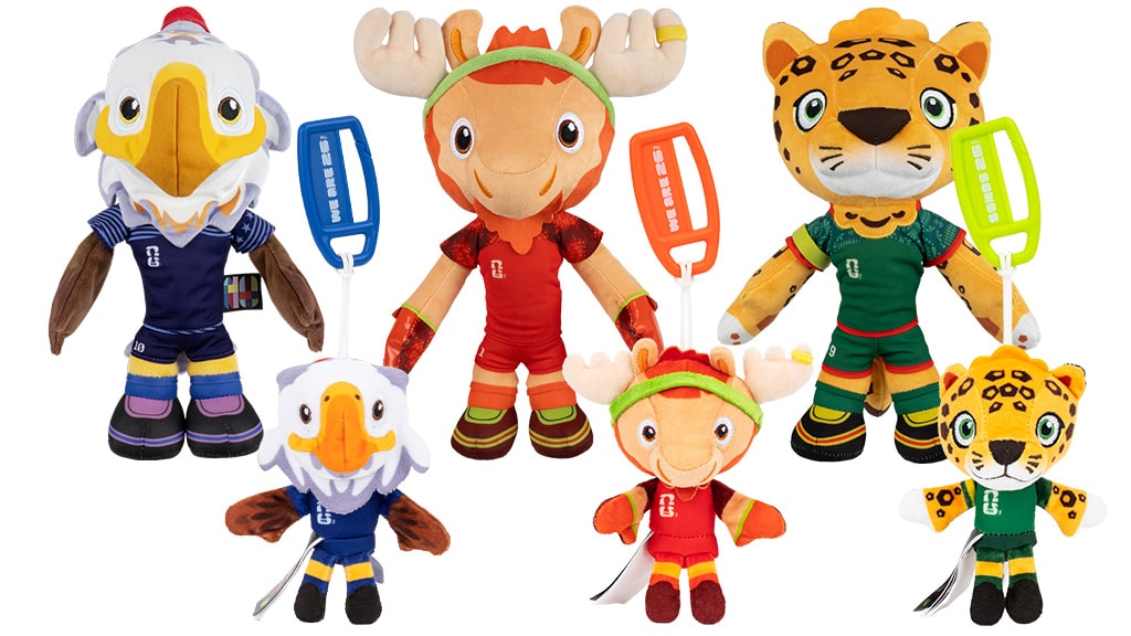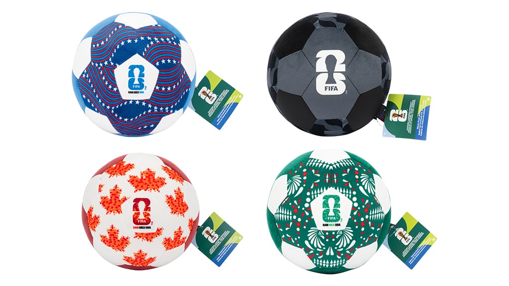 Celebrate the FIFA World Cup 2026 with plush featuring mascots of the host countries: the U.S., Mexico, and Canada. The collection also includes plush versions of the trophy, different soccer balls, and more.