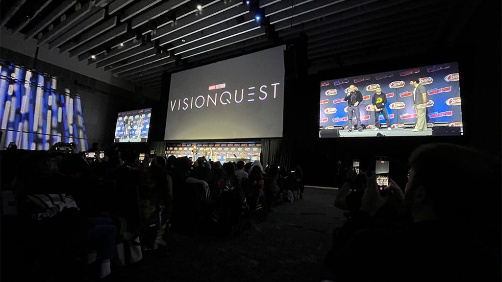 Just when fans thought the panel was over, the Marvel team reminded them that you always stay through the credits. At the very tail end of the panel, Paul Bettany came out on stage to reveal the first trailer for Visionquest, a series following the White Vision we see at the end of WandaVision as he tries to connect with Red Vision’s memories.