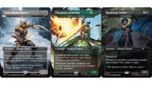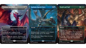 Experience terrifying attacks with The Hunt bundle, perfect for Commander decks as it features monsters on non-creature spells. The Hunters drop depicts different armor sets and weapons from the game series, and includes human creature subtypes. The Monsters bundle includes fan-favorite monsters that now appear as Legendary Creatures in MTG. The Monsters II drop brings more Legendary Creatures to the game with monsters like Razaketh, Amaranth, Wasitora, and Kalamax.