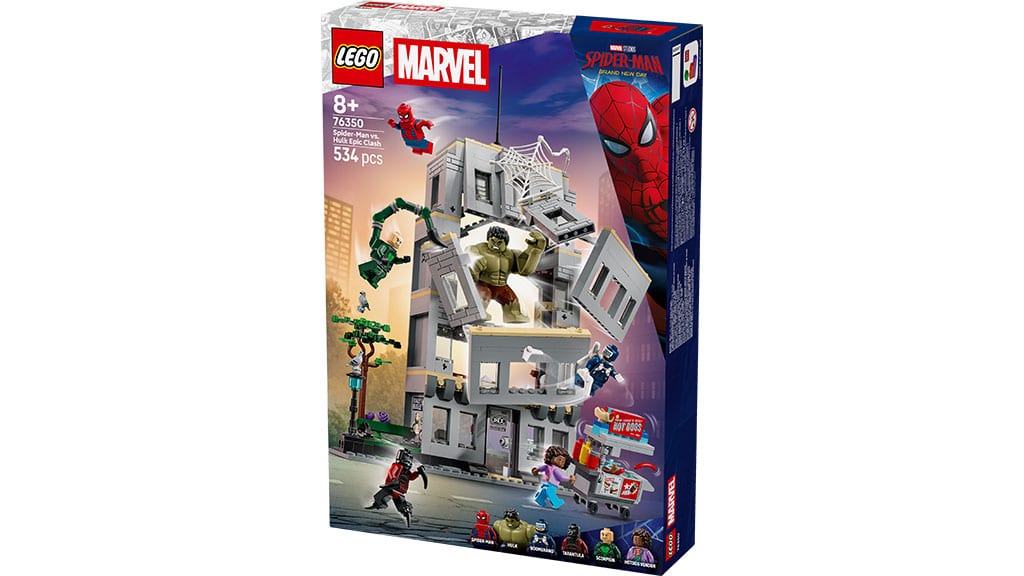 The 534-piece set includes minifigures of Tarantula, Scorpion, Boomerang, Spider-Man, Hulk, and an unlucky hot dog vendor. In this set, the heroes prepare to face off around an office building that Hulk might smash as soon as it’s built.