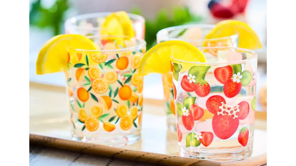 Sip into summertime with these cheerful drinking glasses! Each set includes four glasses, covered in bright citrus and strawberries, with hidden Mickey and Minnie heads as an extra sweet surprise.