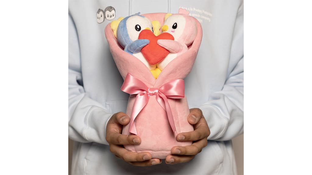 Penguins might live in the cold, but this plush bouquet will definitely warm your heart. The set includes two pastel penguins holding a red heart, bundled up in a pink bow.