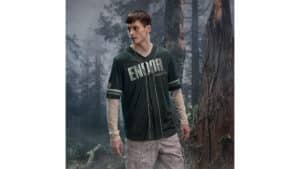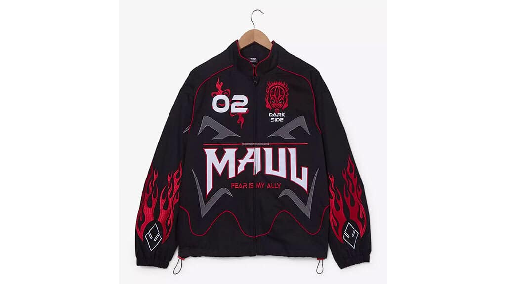 This black moto jacket features embroidered imagery of Star Wars‘ Darth Maul, along with text such as “Fear Is My Ally,” “Sith Lord,” and “Dark Side.”