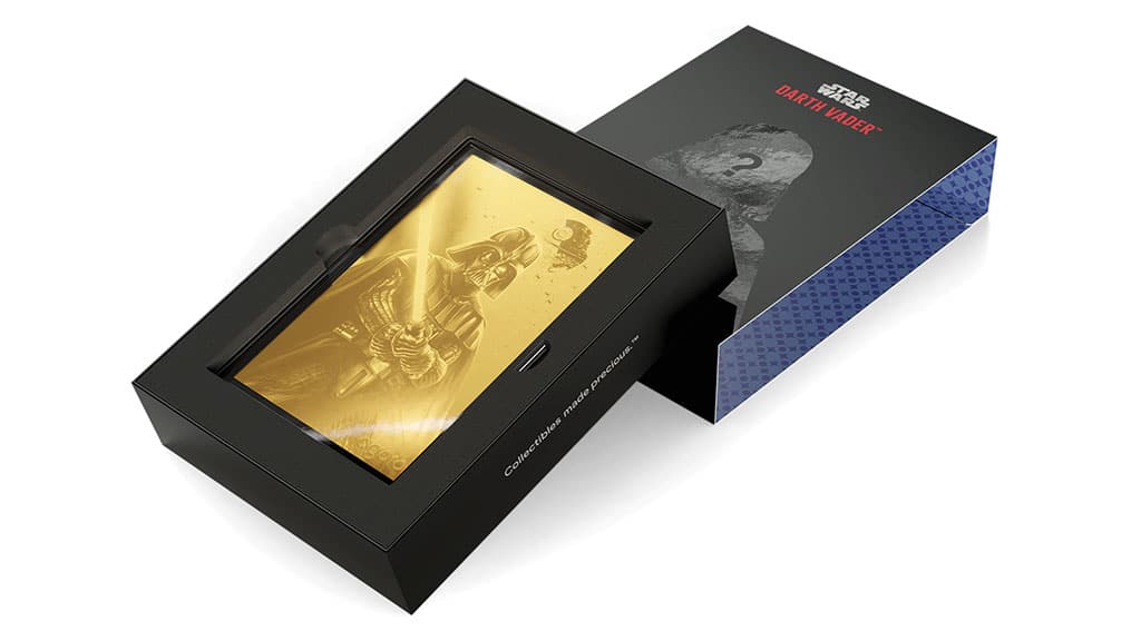 Inside each mystery box is an impressive, most impressive Darth Vader foil engraved in silver or gold.