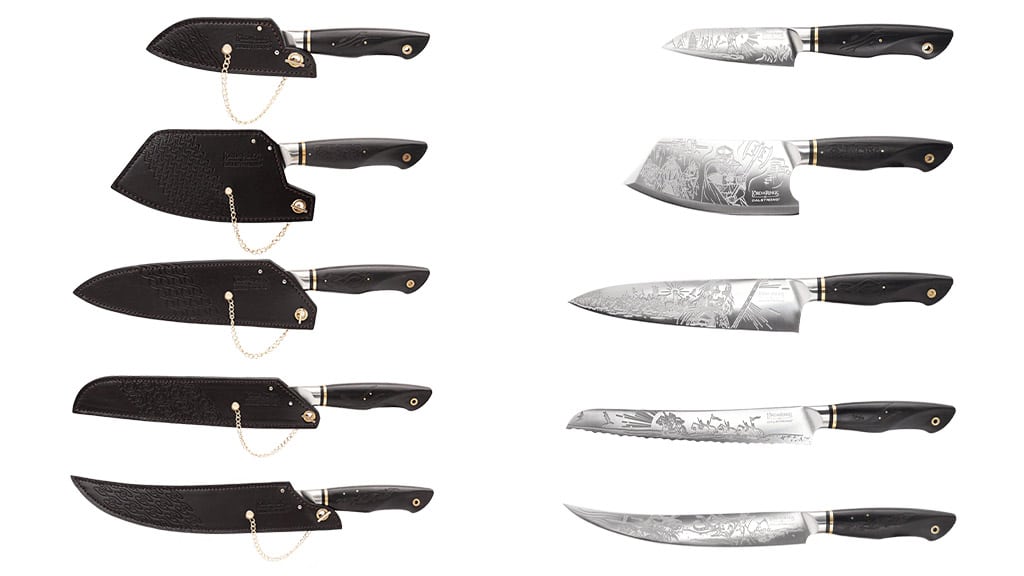 The collection includes six knives that are so sharp, you’d think they were made by Elves. Each piece features a contoured ebony wood handle, a stamped leather sheath, a collectible pin, and a premium German steel blade, etched with artwork inspired by an iconic Lord of the Rings hero.
