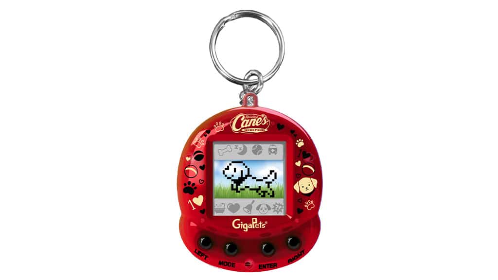 Rebooting the ’90s virtual pet toy trend, this customized GigaPet brings new play experiences with designs and gameplay modeled after Raising Cane’s. From the packaging to the device, fans will find restaurant staples like their “One Love” slogan, signature color palette, and the lovable yellow Labrador retriever, Cane III. The GigaPet also includes a lanyard for on-the-go travel.