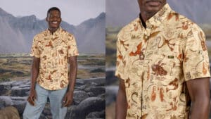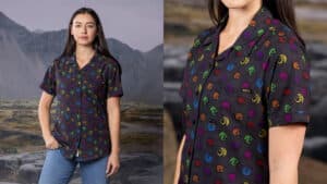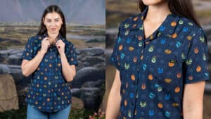 Other hot highlights in the horde include “Fiery Faces,” which features a fearsome fleet of mini fire-breathers; “Sizzlin’ Sigils,” repping each dragon’s iconic symbol; and “Counting Sheep,” a playful design inspired by a dragon’s favorite pastime — hunting sheep! For a stealthier style, throw on the “Unleash the Night Fury” button-down. Featuring Toothless mid-flight against a charcoal sky, this dark design will definitely make you do a double-take.