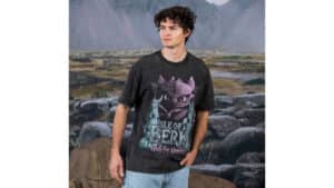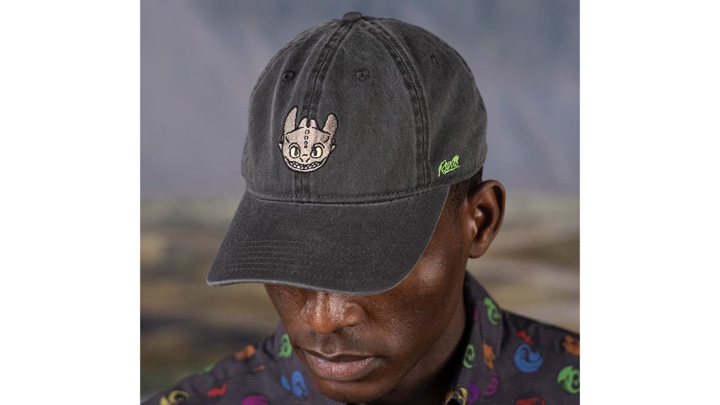 Rounding out the collection is the “Isle of Berk” tee. This vintage-style crewneck stars Toothless front and center, flanked by Viking totems and stamped with the phrase, “Ready for adventure.” Top off your look with an embroidered Toothless Dad Hat, and your fit will be extra fire.