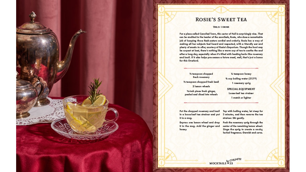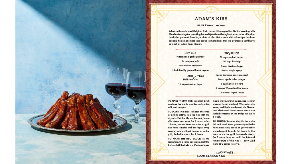 The Hazbin Hotel Bar Book knows that gluttony’s a sin, which is why it also offers a selection of sides and appetizers. Indulge in dips and chips with Niffty’s Favorite Snack, or make sinister sweets with the Charlie’s Cordial Cake recipe. Gluttons can also satisfy their hunger with filling dishes like Angel Wings, Pulled Shoulder Nachos, and Cannibal Town-Style Chili.